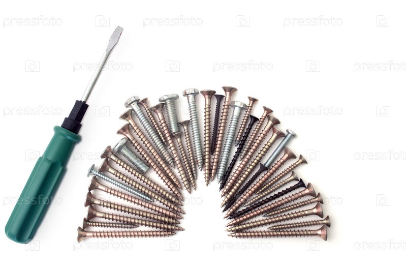 Отвертка болты и винты на белом фоне