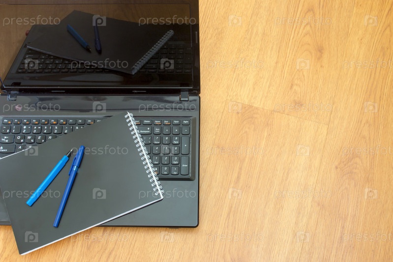 Ноутбук на столе с блокнотом