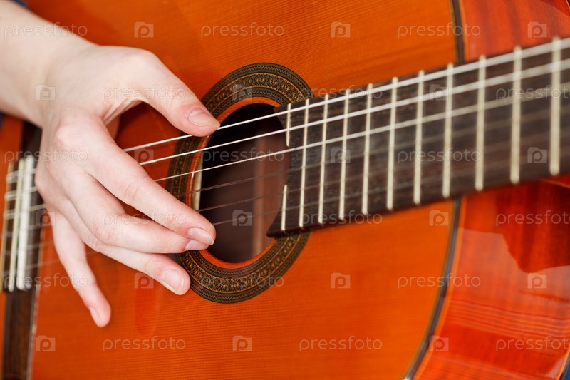 Женская рука играет на гитаре