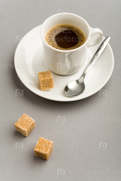 Изображение белой чашки, наполненной сильным черным кофе и двумя кусками тростникового сахара рядом