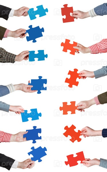 Красные и синие куски головоломки в руках людей