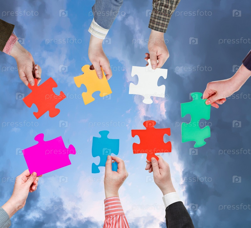 Разноцветные куски головоломки в руках людей