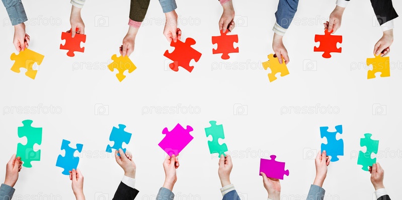 Разноцветные куски головоломки в руках людей