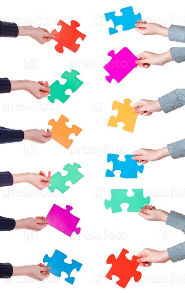 Разноцветные куски головоломки в руках людей