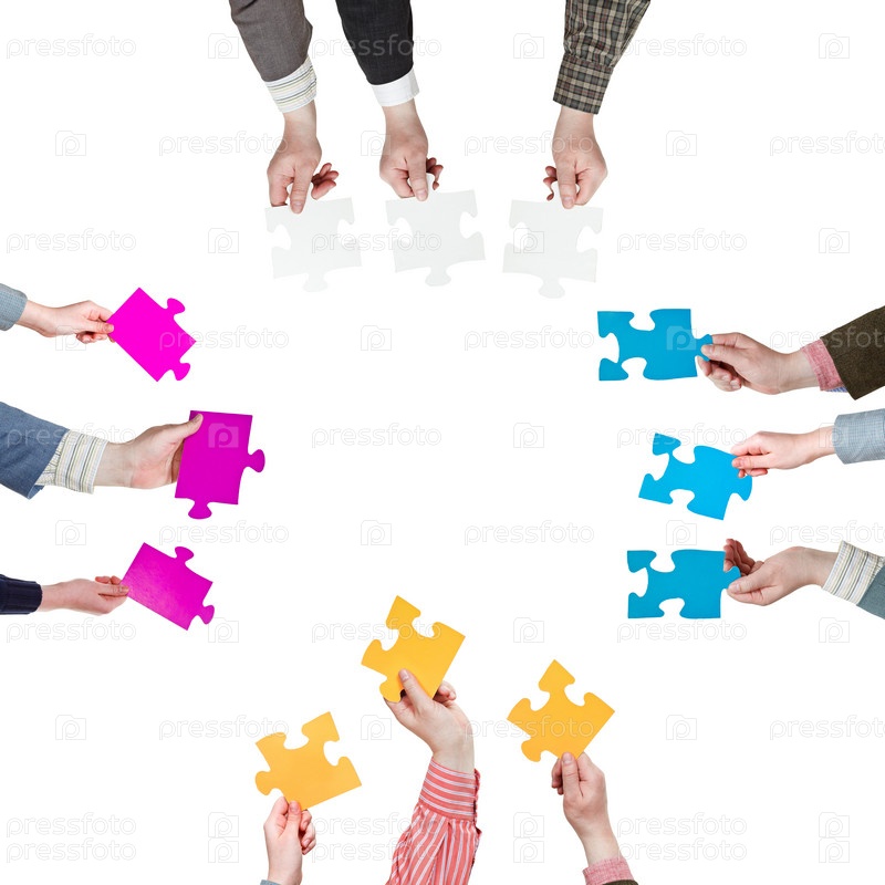 Разноцветные куски головоломки в руках людей