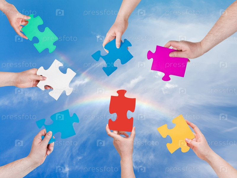 Разноцветные куски головоломки в руках людей