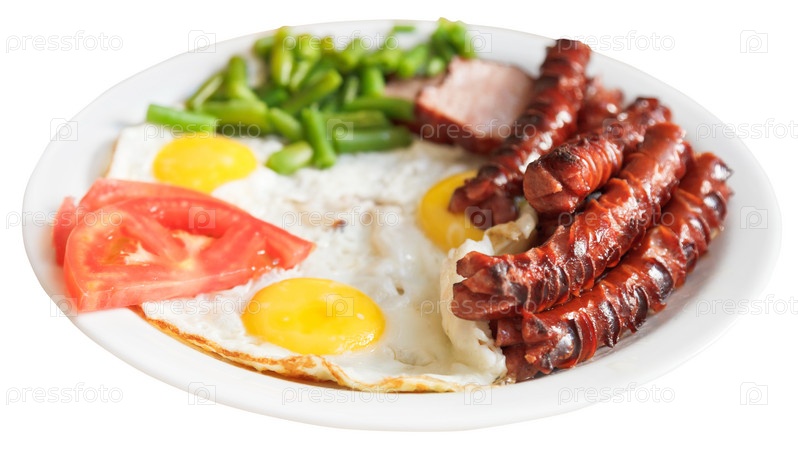 Завтрак жареные яйца, сосиски, помидоры и фасоль