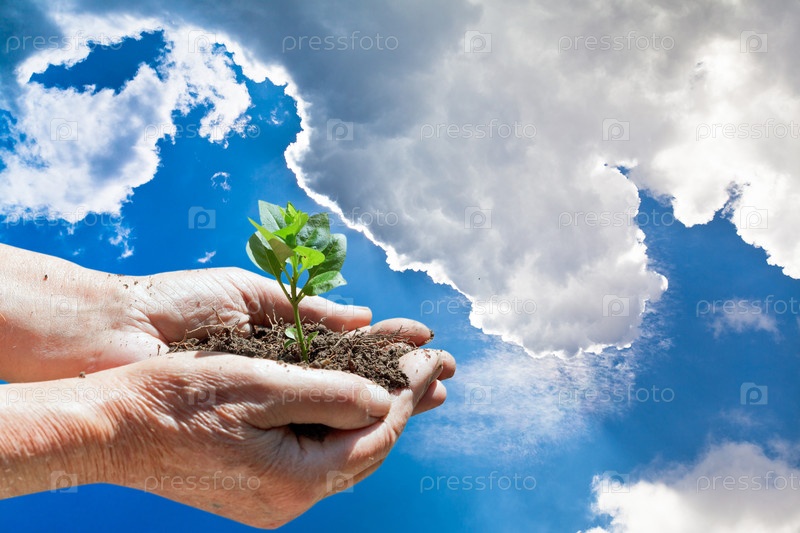 Горсть почвы с зеленым ростком в руках