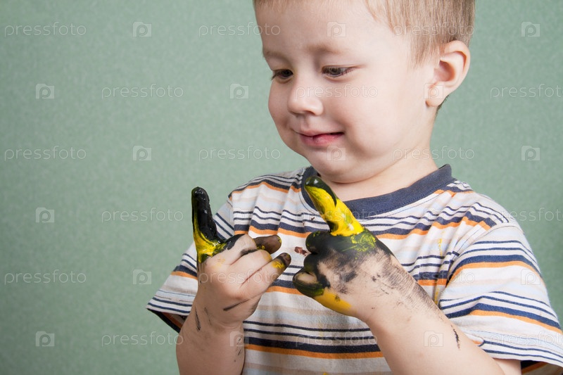 Маленький мальчик с вымазанными в краске ручками