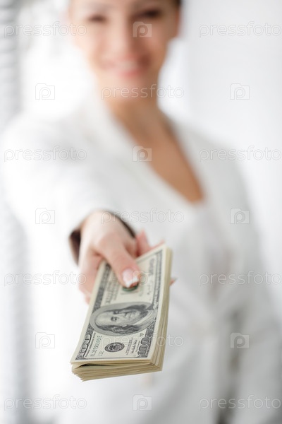 Деловая женщина протягивает пачку долларов