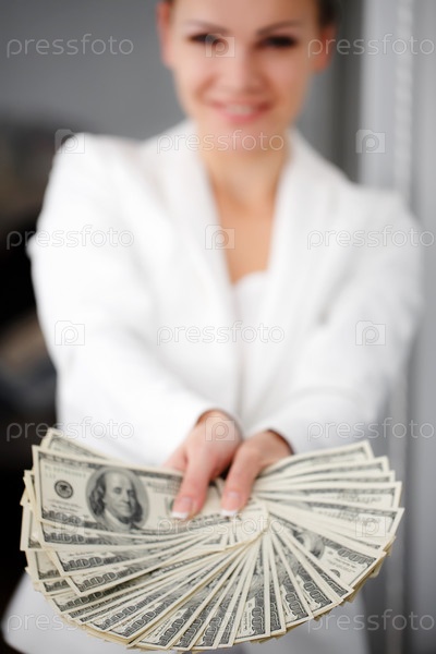 Веер долларовых банкнот в руке деловой женщины