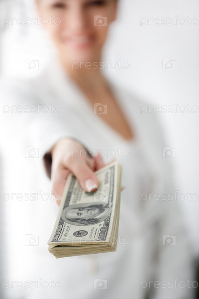Деловая женщина протягивает пачку долларов