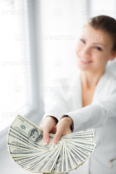 Деловая женщина протягивает пачку долларов