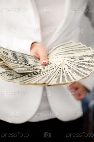Веер долларовых банкнот в руке деловой женщины