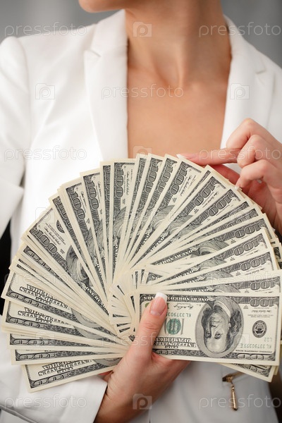 Веер долларовых банкнот в руке деловой женщины