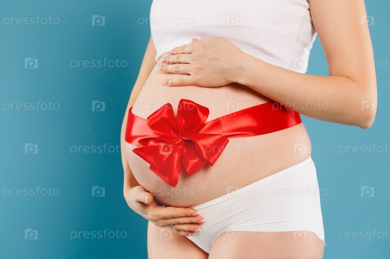 Беременная девушка с алым бантом на животе