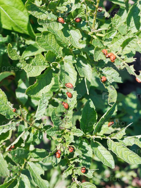 Многие личинки жука на кустах картофеля