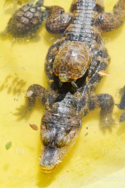 Красноухая черепаха над аллигаторе