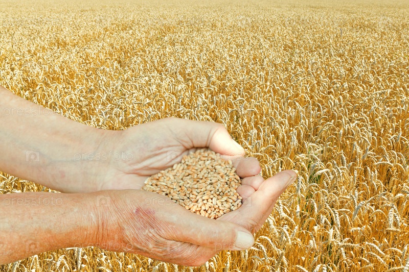Руки держат семена на пшеничном поле