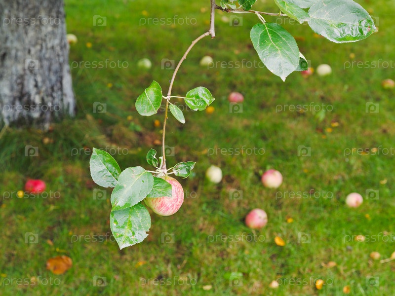 Спелые яблоки лежат под яблоней