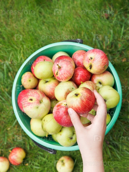 Девочка собирает яблоки в ведро