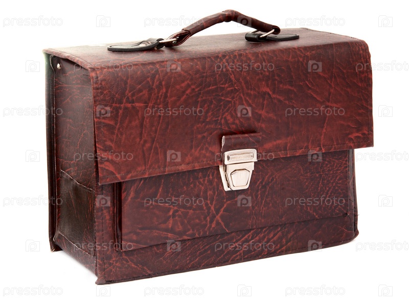 Коричневый кожаный портфель крупным планом. Изолированный на белом фоне