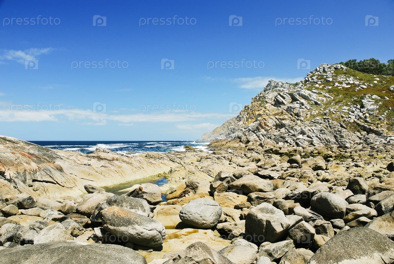 Каменный пляж острова Сиес в Атлантике, Испания