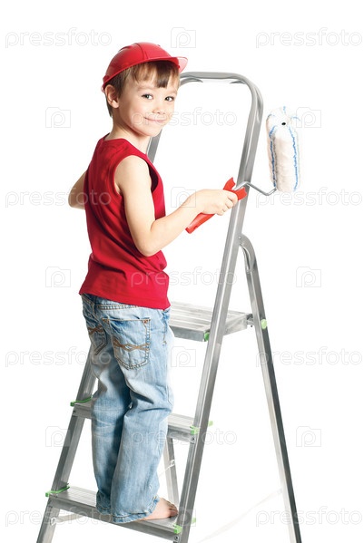 Маленький ребенок в форме рабочего с валиком сидит на стремянке на белом фоне