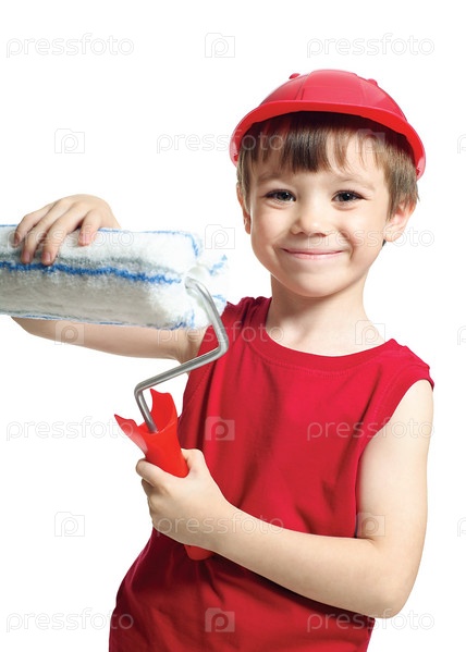 Маленький ребенок в форме рабочего с валиком на белом фоне