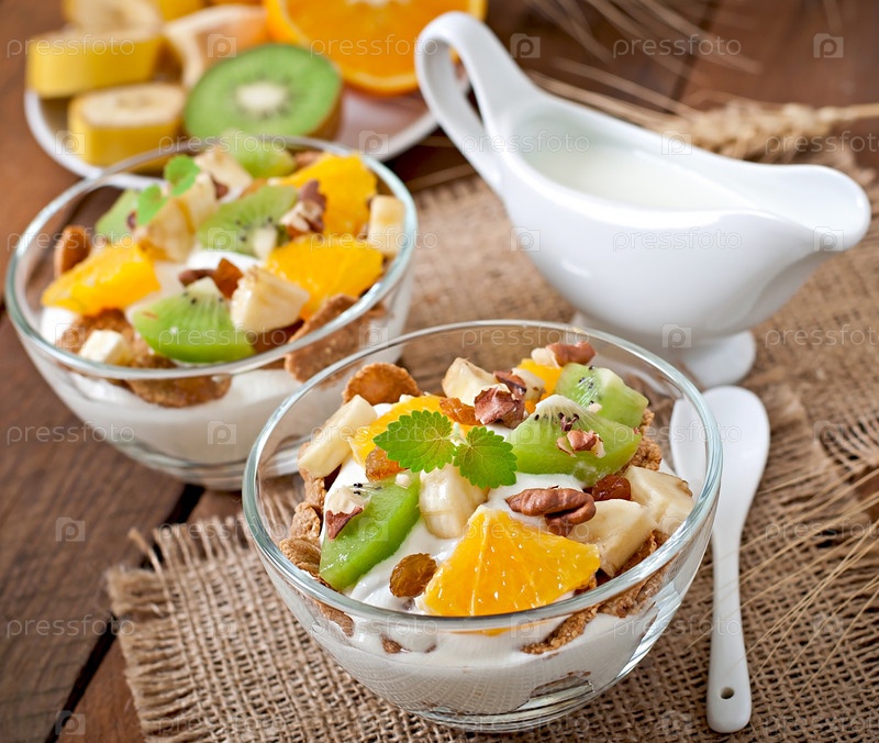 Здоровые десерт с каши и фрукты в миску стакан на столе