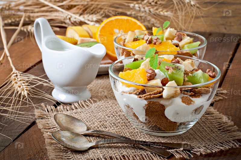 Здоровые десерт с каши и фрукты в миску стакан на столе