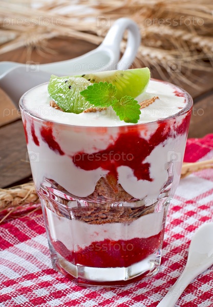 Здоровые десерт с каши и фрукты в миску стакан на столе