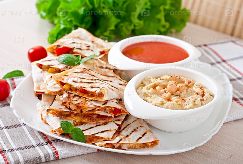 Мексиканские Кесадилья нарезанные овощи и соусы на столе