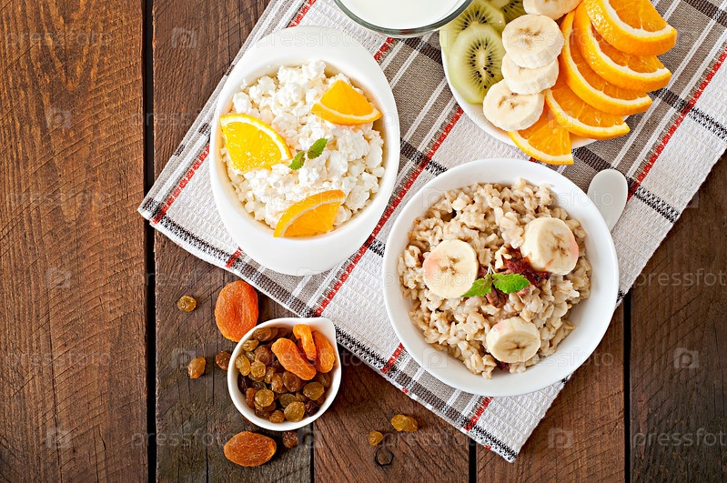 Здоровый завтрак - овсянка, творог, молоко и фрукты