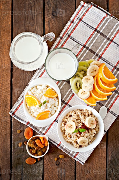 Здоровый завтрак - овсянка, творог, молоко и фрукты