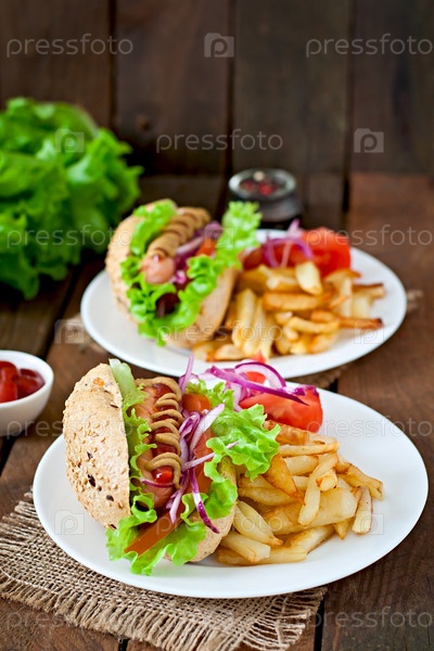 Хот-доги с картофелем на белом фоне, макро