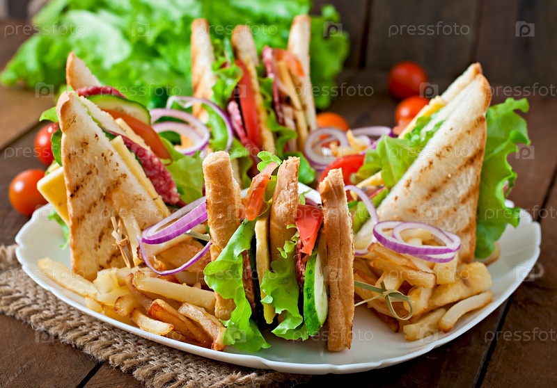 Клаб сэндвич с сыром, огурец, помидор, копченое мясо и колбасы. Подается с картофелем