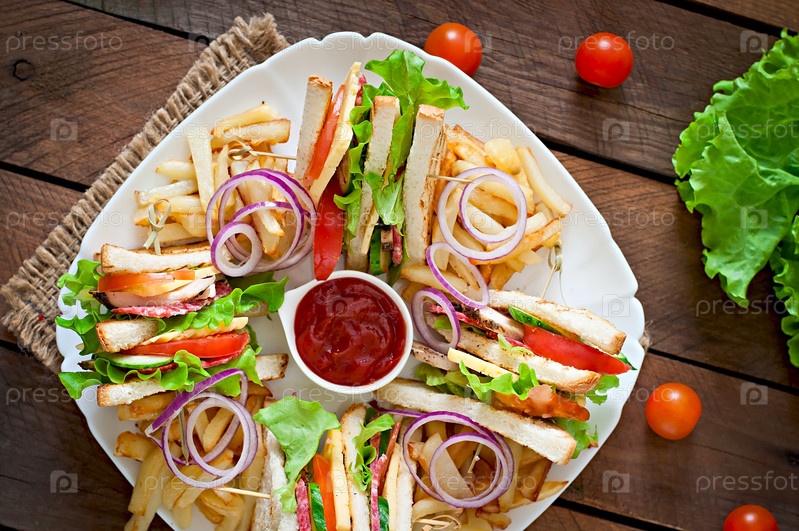 Клаб сэндвич с сыром, огурец, помидор, копченое мясо и колбасы. Подается с картофелем