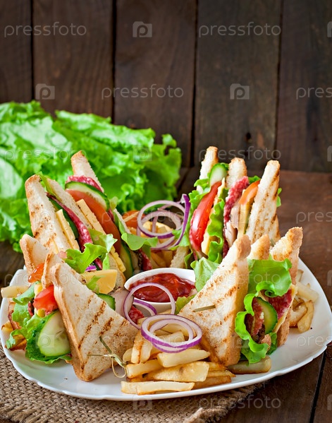 Клаб сэндвич с сыром, огурец, помидор, копченое мясо и колбасы. Подается с картофелем
