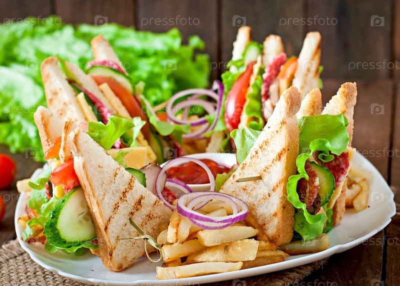 Клаб сэндвич с сыром, огурец, помидор, копченое мясо и колбасы. Подается с картофелем
