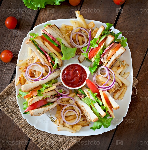 Клаб сэндвич с сыром, огурец, помидор, копченое мясо и колбасы. Подается с картофелем