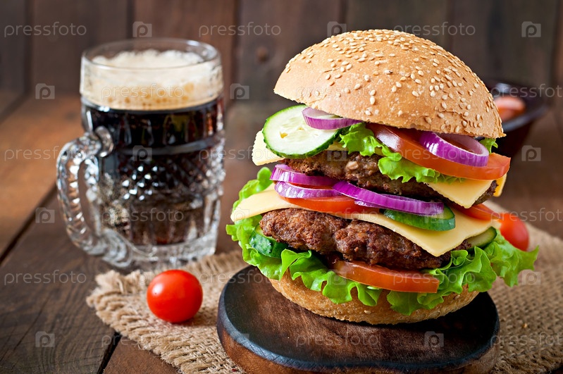 Большой сочный гамбургер с овощами и говядиной на деревянных фоне в деревенском стиле