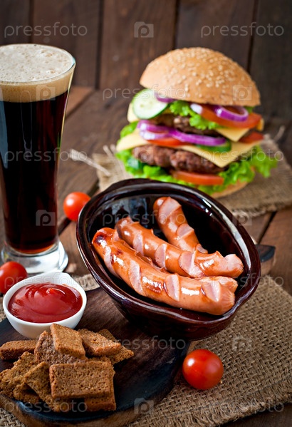 Колбаски гриль, крекеры и пиво на деревянных фоне в деревенском стиле