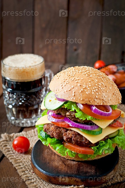 Большой сочный гамбургер с овощами и говядиной на деревянных фоне в деревенском стиле