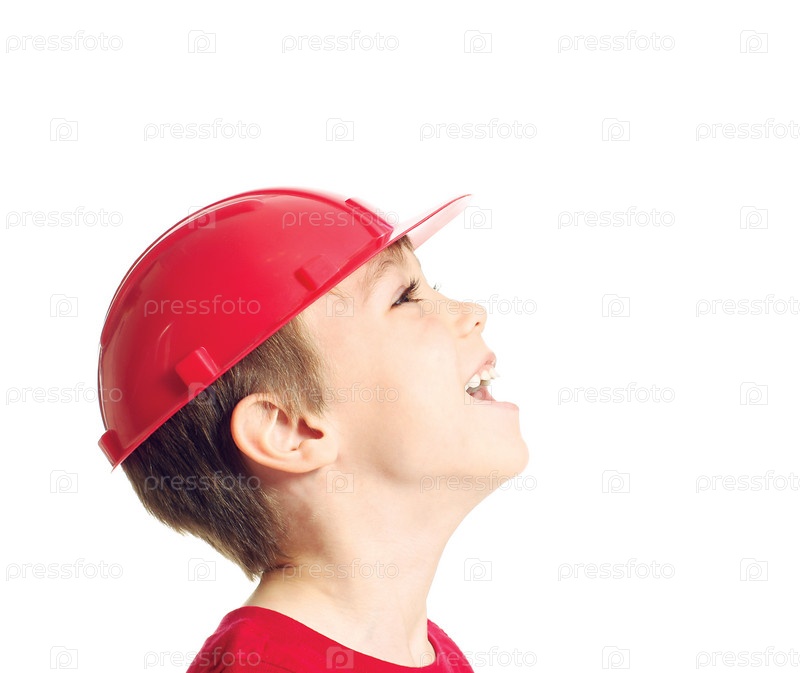 Портрет маленького мальчика в каске на белом фоне