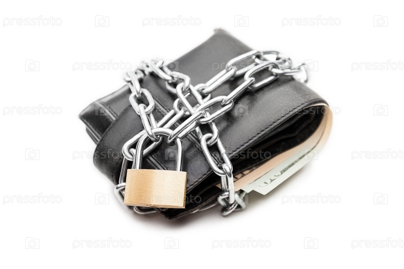 Замок цепи на кожаный бумажник, полный денег валюты доллар