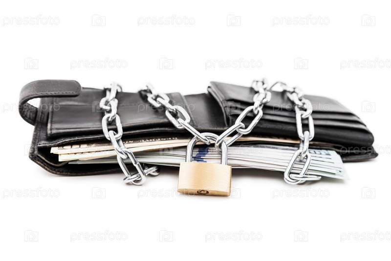 Замок цепи на кожаный бумажник, полный денег валюты доллар