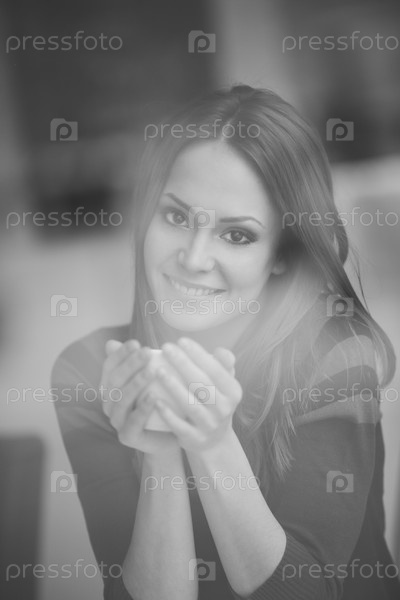 Лучезарная девушка в кафе с чашкой чая, через стекло