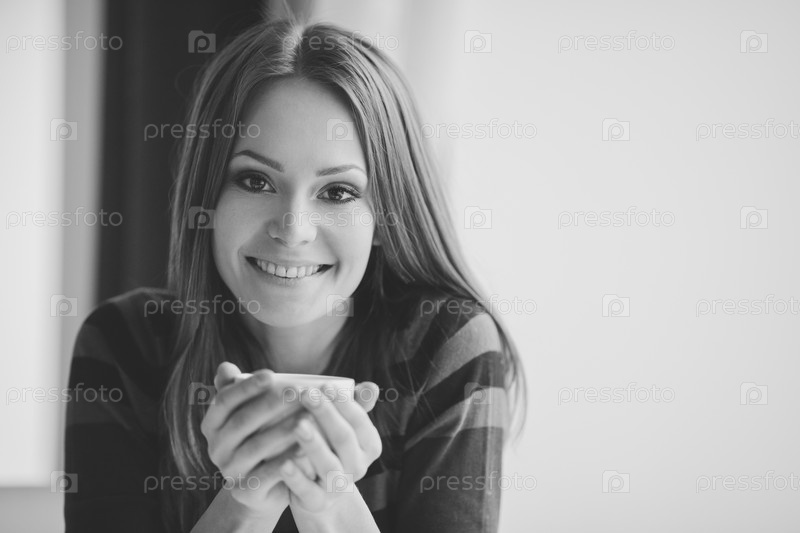 Лучезарная девушка в кафе с чашкой чая