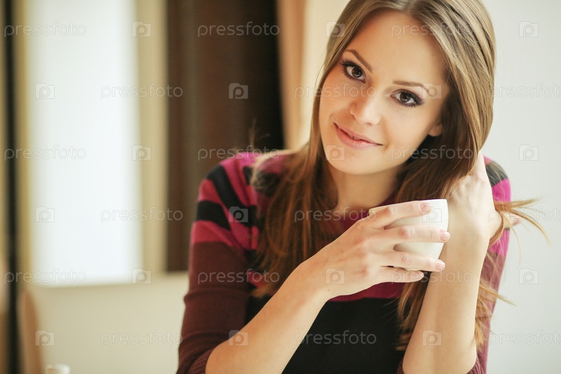 Лучезарная девушка в кафе с чашкой чая смотри в окно